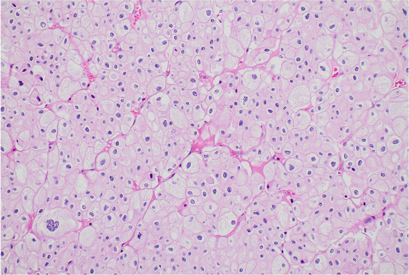 El carcinoma cromófobo de células renales presenta rasgos citológicos característicos, como células poligonales con citoplasma abundante eosinofílico o reticular y membranas celulares bien definidas. Sin embargo, hallazgos clásicos como los halos perinucleares y núcleos arrugados pueden no ser tan evidentes, como en nuestro caso, generando solapamiento con el oncocitoma, principal diagnostico diferencial, que muestra mayor monotonía celular y citoplasma homogéneo, sin reticulación ni vacuolización.3
